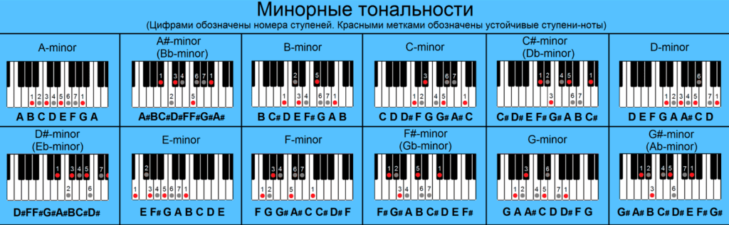 - Запоминайте характерные аккорды для мажорных и минорных тональностей.